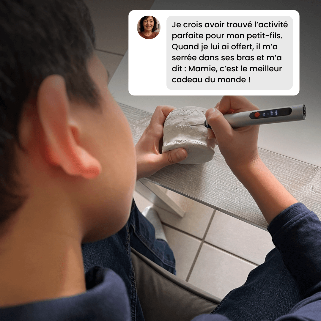Oui, tout à fait ! Le stylo peut être utilisé par des enfants sous la supervision d’un adulte. Il est léger, facile à manier et ils peuvent graver en toute sécurité sur du bois, du plastique ou même des galets. C’est une excellente activité créative à partager en famille !